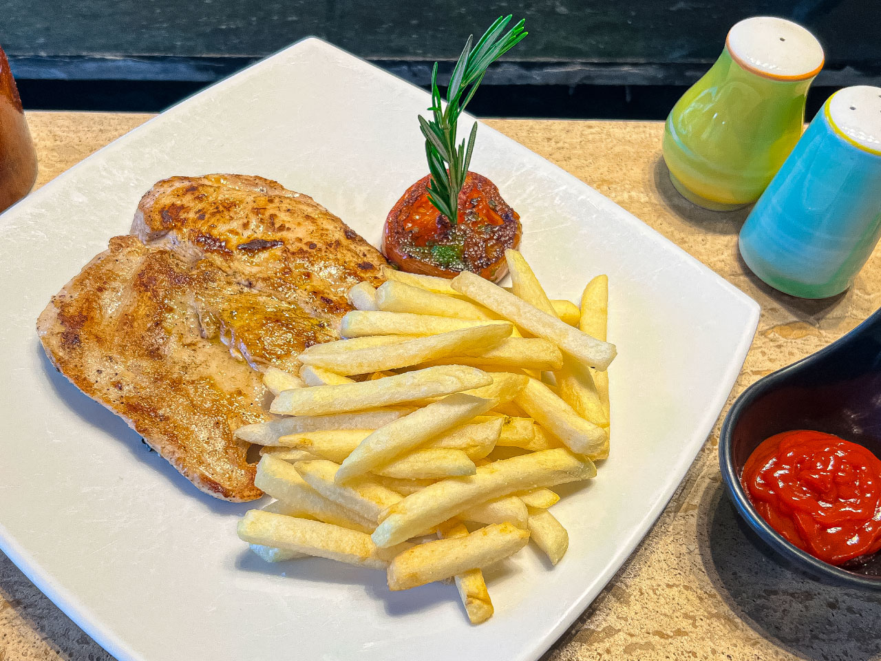 250gr. de pechuga de pollo a la plancha, acompañada con papas a la francesa y ensalada mixta.