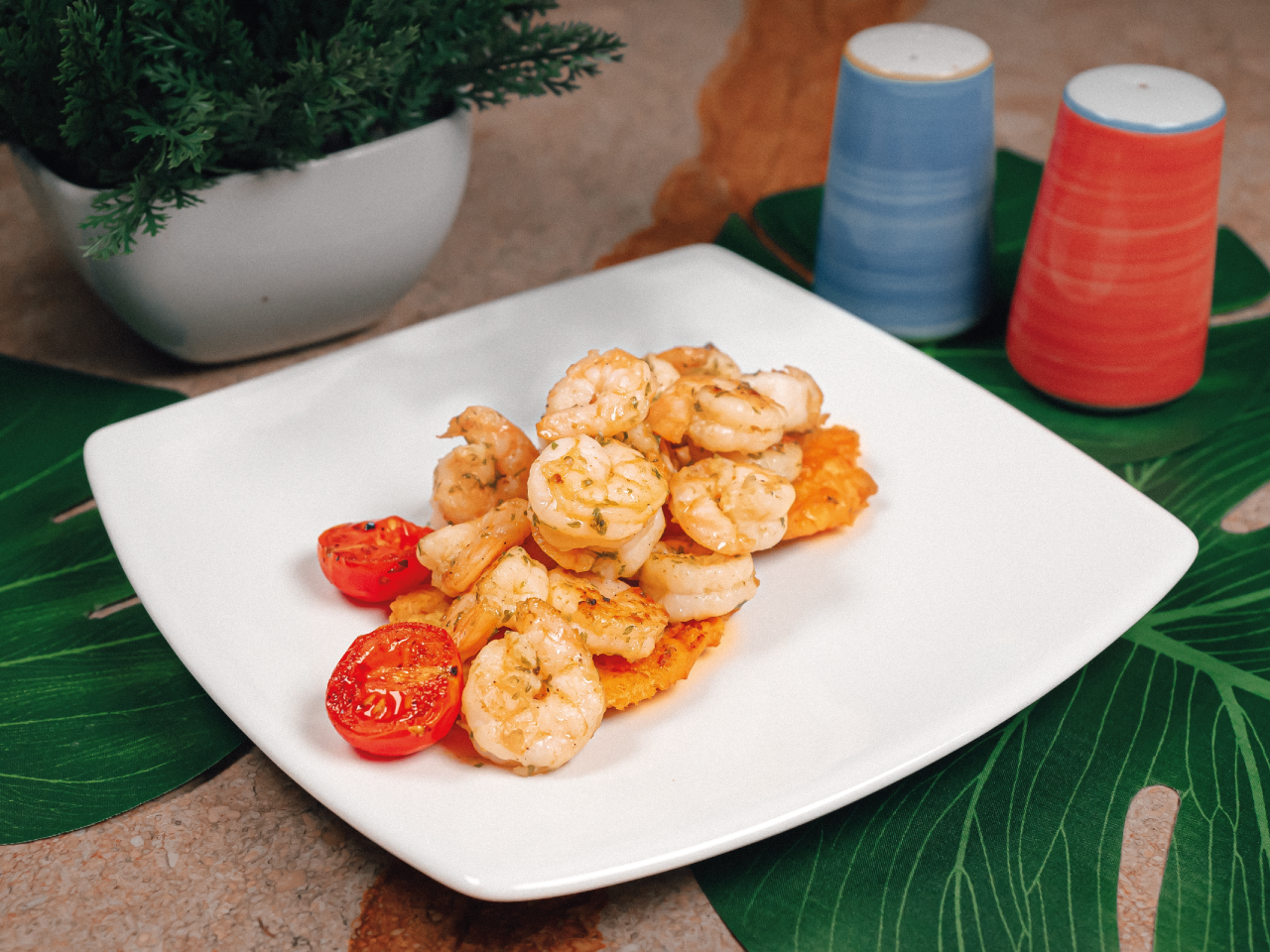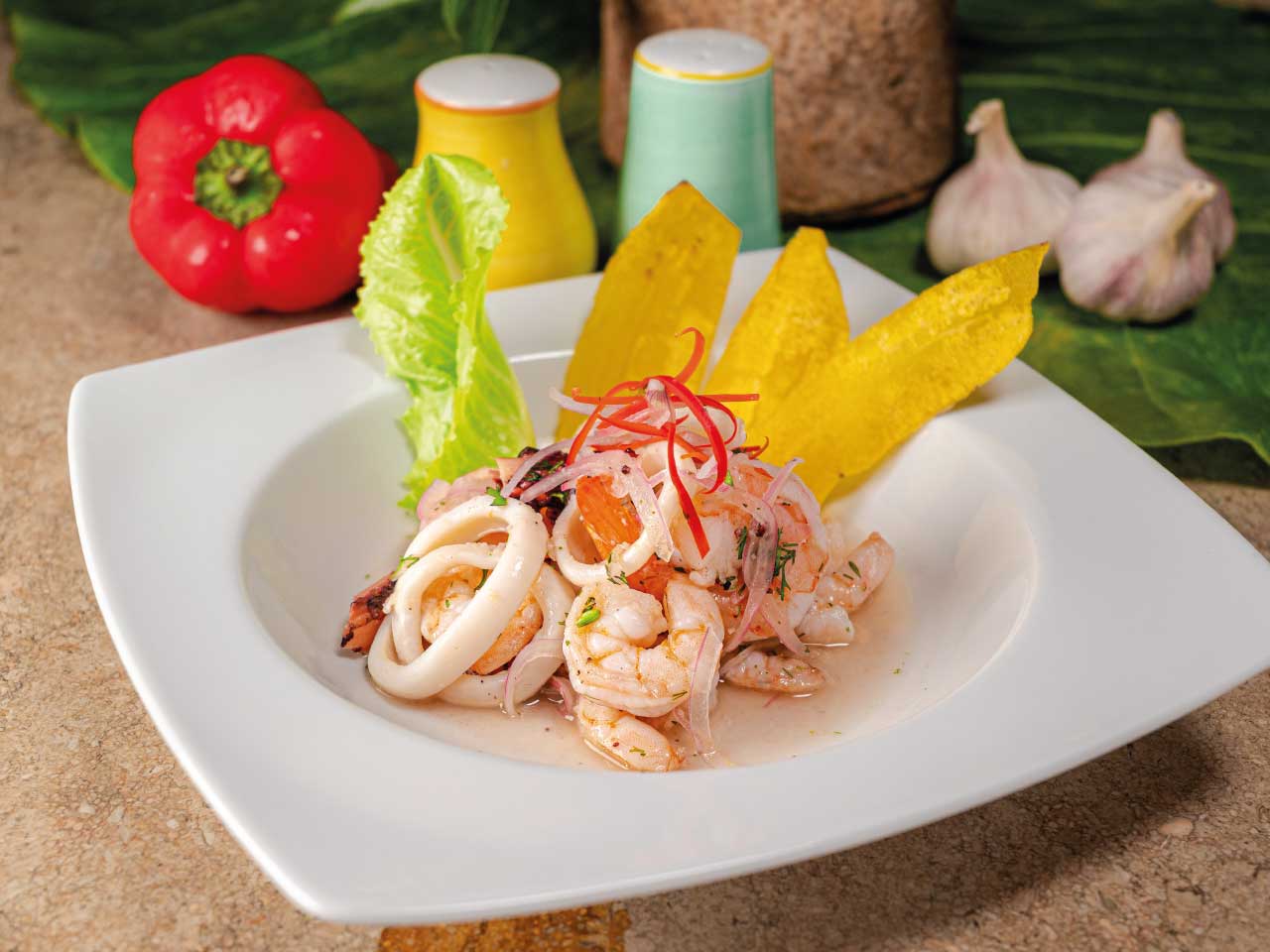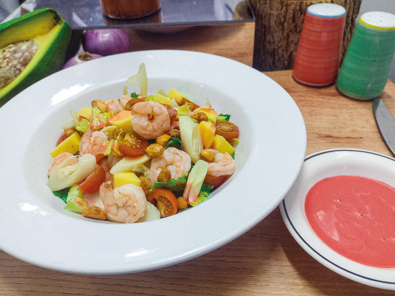 Lechuga, palmitos, coco confitado, mango, tomates y camarones, con vinagreta de corozo.