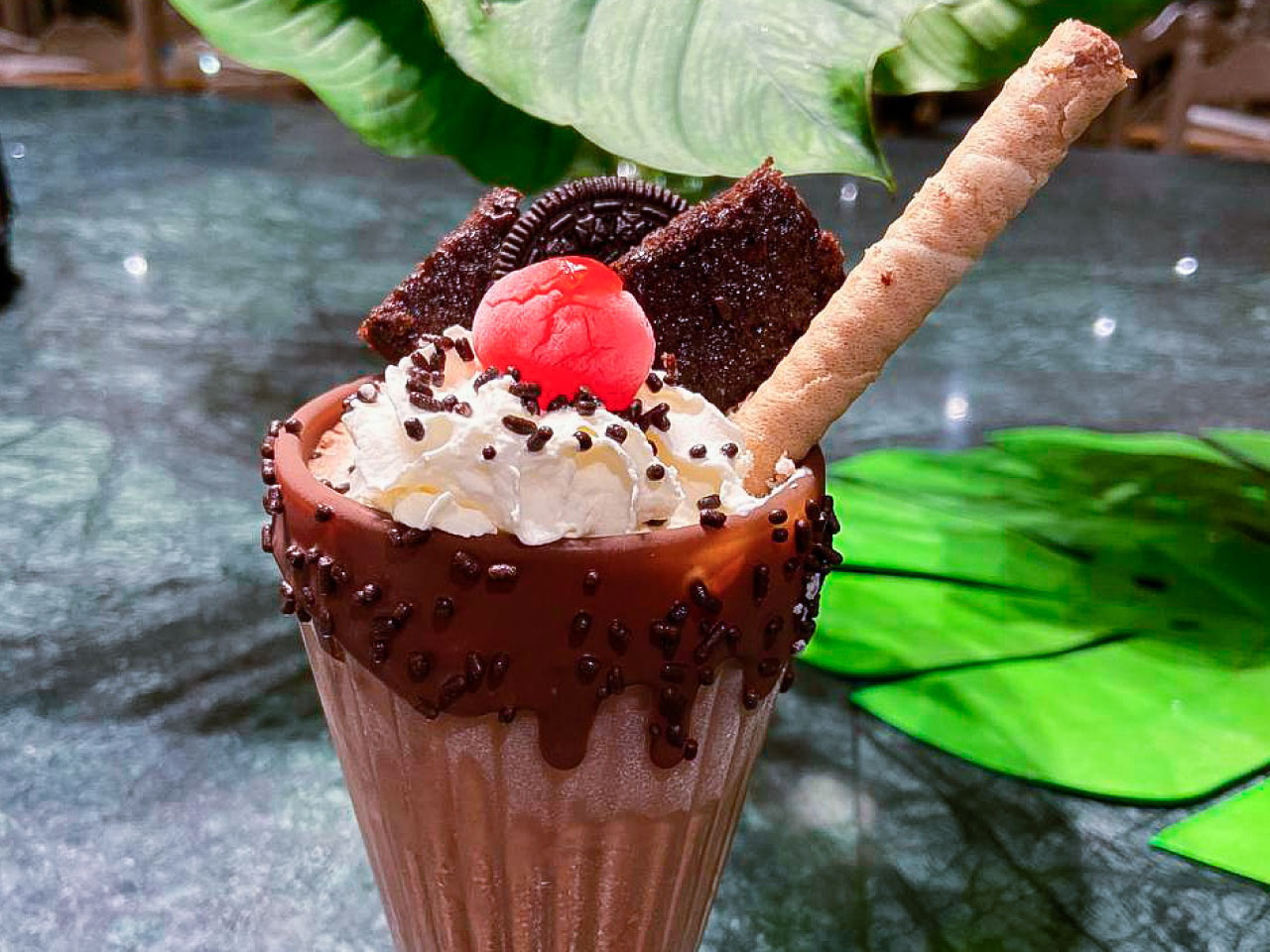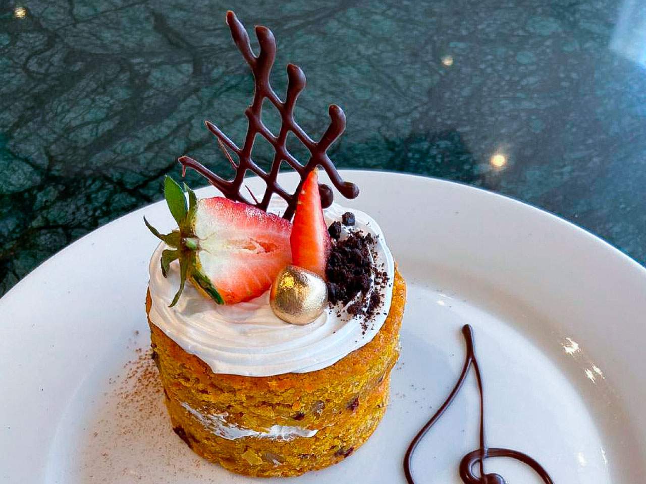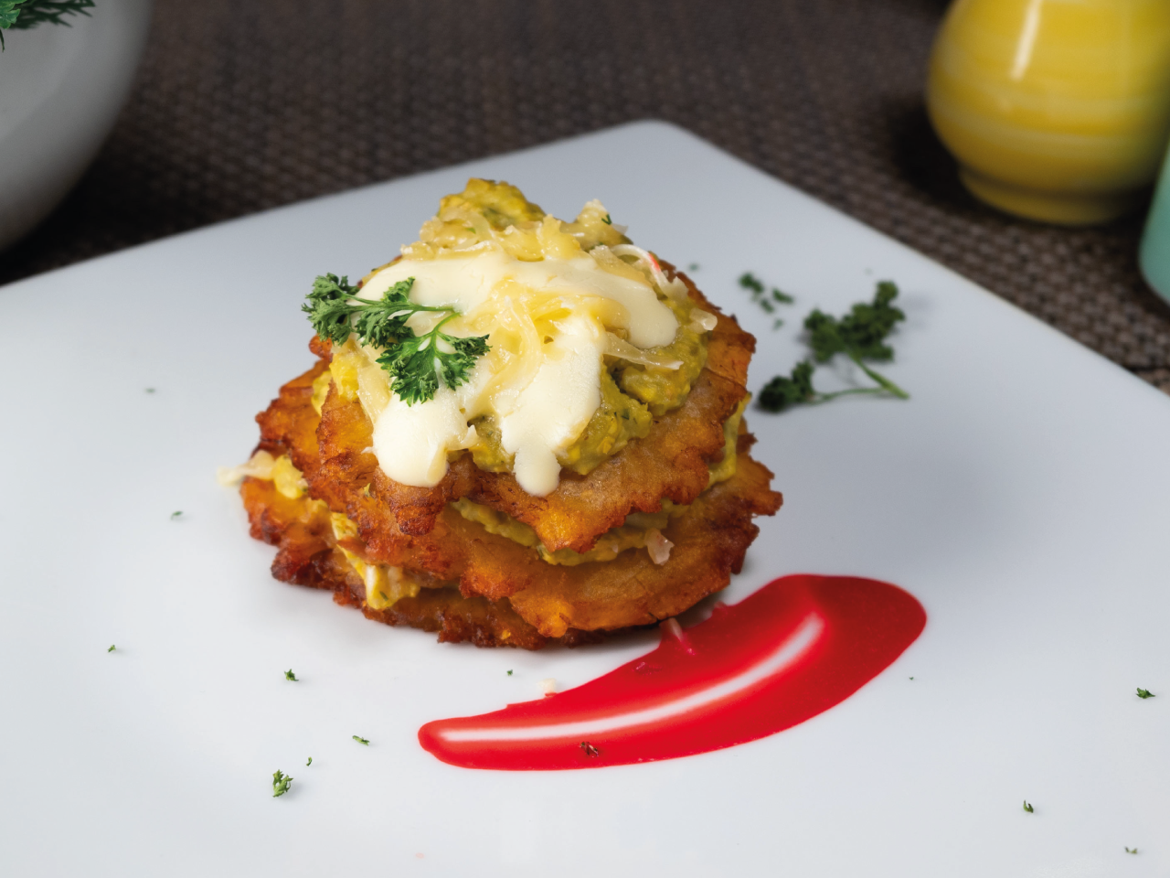 Lechuga, palmitos, coco confitado, mango, tomates y camarones, con vinagreta de corozo.