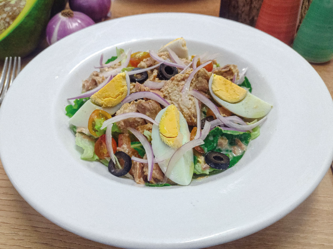 Lechugas verdes y moradas, cebolla morada, tomate cherry, aceitunas negras, huevo y atún.